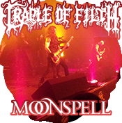 Das beste Konzert der Woche findet an diesem Abend mit den Bands aus Portugal und England statt, denn sie zeigen besonders viel Spaß am Metalisieren und dieser Funke springt heftig aufs Publikum über. Der Großteil des Konzerts von Moonspell wird dem neuen Album 1755 gewidmet. Anschließend gibt's noch die älteren Titel "Wolfshade", "Alma Mater" und "Opium". Gut gewählt und noch besser präsentiert. Wie gewohnt kann Sänger Fernando und Kollegen sehr schnell die Zuschauer von 0 auf 100 bringen. Eine der besten Live-Bands, die man sich vorstellen kann. Cradle of Filth proftieren von der großen Auswahl an düsteren Hits, die sich mittlerweile angesammelt hat und einer theatralischen Bühnenshow inklusive Tänzerin, welche Schröder allerdings nicht gefällt. Vom aktuellen Album Cryptoriana gibt's "Heartbreak and seance". Darüber hinaus (gleich am Anfang wieder) "Gilded Cunt" und natürlich "Her Ghost in the fog" zum Schluß. Beeindruckend wie viele "Filthians" hergepilgert sind um der Wiege der Unflat mit Hauptgeist Dani zu huldigen. Der kleine Schreihals quiekt seine charakteristischen Einlagen gekonnt mit für die meisten schwierig zu verstehenden Texten - sowohl akustisch als auch inhaltlich. |