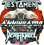 Mark Osegueda von Death Angel verwechselt erst Mal den Freitag mit Samstag und genehmigt sich ein Schlückchen Bombai Sapphire Gin, dann geht das Konzert los mit feinstem Bay Area Metal und gut gelaunten Musikanten. Oh, wie habe ich es vermisst, einfach nur geradlinigen Thrash zu hören. Dabei ist die Band als Einheitzer zu gut. Annihilator hat gerade ein neues, besseres Album ("For the demented") raus. So richtig mitreissen kann das Konzert nur wenige, was wie immer unterschiedliche Gründe hat. Jeff Waters als einziges Urmitglied ist ausgerechnet nicht der beste Musiker und wird nie mehr so ein toller Entertainer, wie es Osegueda oder Chuck Billy sind. Außerdem weigern sich die Kanadier viele ihrer zugegeben vorhandenen Hits zu spielen. Mit mäßigem Sound aber viel Lust tritt dann Testament auf die Bühne. Außer wenigen neuen Titeln wie "The pale king" oder "Rise up" gibt's hauptsächlich echt alten Kram, was die Zuhörer gerne annehmen. Sind eben super Sachen, etwa der Nackenbrecher von 1994 "Low". Testament ist mit Kreator momentan die genialste Band dieser Stilrichtung und wird entsprechend entzückt abgefeiert. Brütalst! |