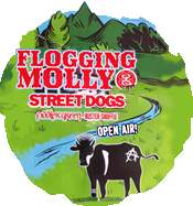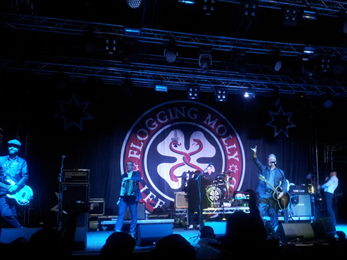 21:30 Uhr versammelt sich die Hauptband Flogging Molly auf der Rampe. Ich bin ganz vorne, knipse ein paar Bilder für Schnapsunmetal. Keine Sekunde zu früh, denn meine Vermutung, es entstünde ein hüpfender und tanzender Ringelreihen, ist richtig. Dem ist auch kein Entkommen, denn so weit man blickt machen alle mit. Ob groß ob klein, Madeln oder Buam, alle nehmen am Vollkontakt-Tanz teil. Es gibt die Wand des Todes, Pit-Ruderboot und jeder Menge auf dem Publikum schwimmende Damen und Herren. Die legendären Irish-Folk-Kerls aus Los Angeles um den Iren Dave King unterstützen das Treiben gerne mit ner Menge Ausstrahlung und viel Spaß am Musizieren. Muss schon sagen: Das war ein wirklich gelungener Auftritt! |