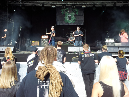 16:45 Uhr: Nach der Absage von Buster Shuffle springen die Lokal-Kleeblätter Feelgood McLouds ein. Die Saarländer verströmen immer gute Laune und sind genial als erste Band, wie schon beim AntAttack-Festival. Leider vernimmt man den guten Flötisten/Sackpfeifer rechts kaum. Mit ihren großen Vorbildern Flogging Molly können sie aber (noch) nicht mithalten.