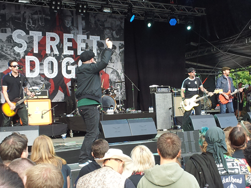 17:50 Uhr: Prächtige Boston-Originale treten dann auf die Bühne: Die Street Dogs (Bild oben) spielen echten Ostküsten-Hardcore. So entsteht sofort eine Rempelregion im Publikum inklusive eines sehr großen Punks, der glaubt sein Bierkrug überstünde die Körperkontakte. Der Kruginhalt ergießt sich alsbald über seinen Körper. Die Band spielt indessen richtig arschtretenden, aggressiven Kram - supergoooil!
